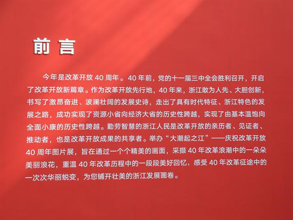 中共浙江省委常委、宣传部部长朱国贤宣布“大潮起之江——浙江省庆祝改革开放40周年”图片展开幕。本次图片展由中共浙江省委宣传部、浙江省文化厅、浙江日报报业集团、浙江广播电视集团、浙江省文学艺术界联合会主办,分“序篇”“忆·如歌岁月”“立·时代潮头”“享·美好生活”4个篇章,共展出680幅(组)1300余张作品,集中展示浙江改革开放40年来的光辉历程、伟大成就和宝贵经验,特别是“八八战略”实施15年来改革开放和社会主义现代化建设取得的历史性成就和历史性变革。