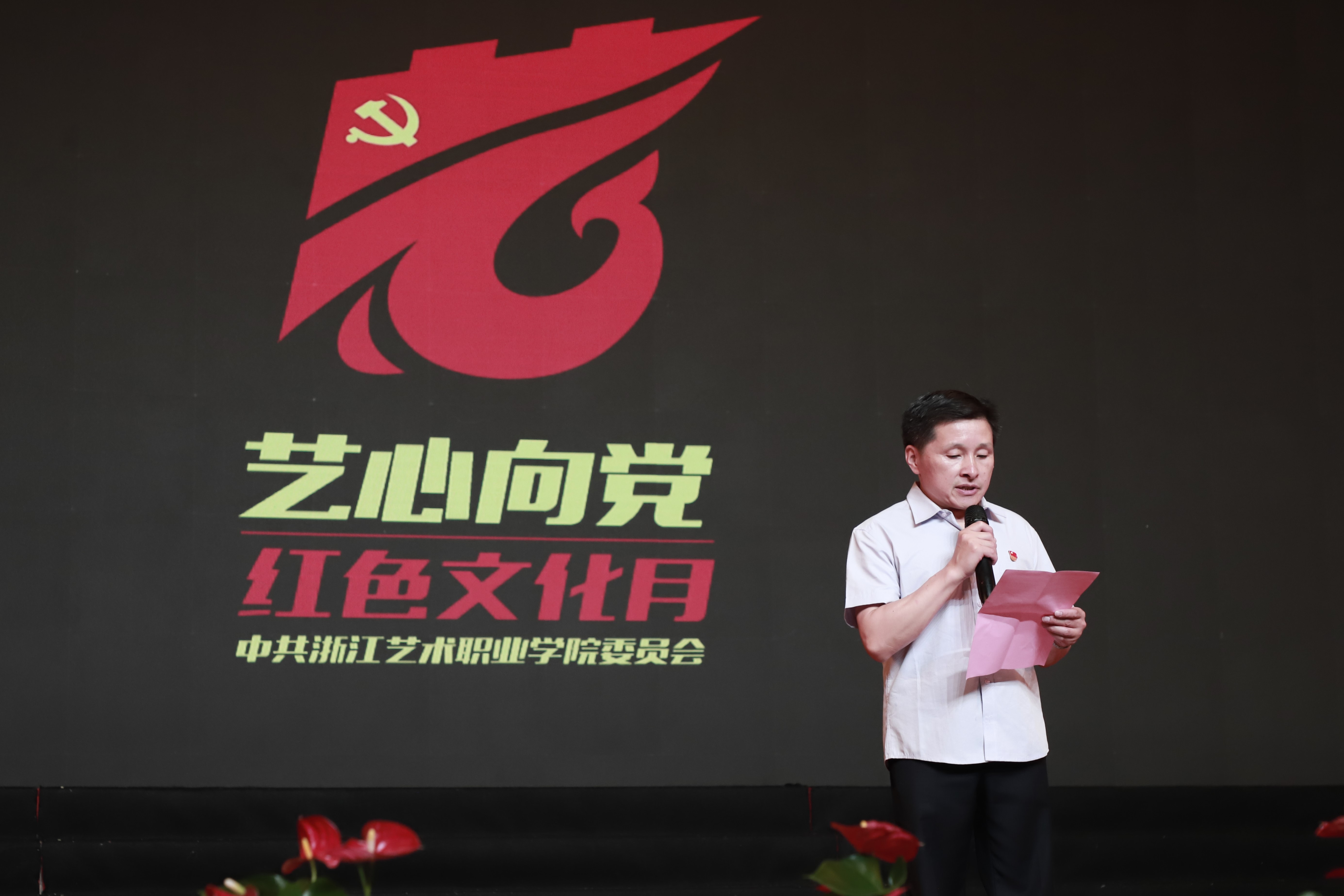 大会首先发布学校“红色文化月”品牌名称和logo,由党委组织部定义,美术系党总支报送,党员教师叶峰泉设计。校党委班子全体成员共同按下手印,启用品牌名称和logo。校党委委员、宣传部部长马向东受党委委派作了品牌logo解说,阐述了品牌logo设计理念。标志整体选择了能够全面展现我校特色的“艺”字作为主体,上半部分融入“党旗”、“长城”等元素与字体笔画结合,下半部分将“一”字与“心”字融合,展现了“艺心(一心)向党”的主旨。设计中融入我校校标优美的曲线律动,厚植“求真 尚美 精艺 修为”校训精神,秉承“心有大我、至诚报国”的爱国情怀,引领全体党员“积极作为、主动担当”。