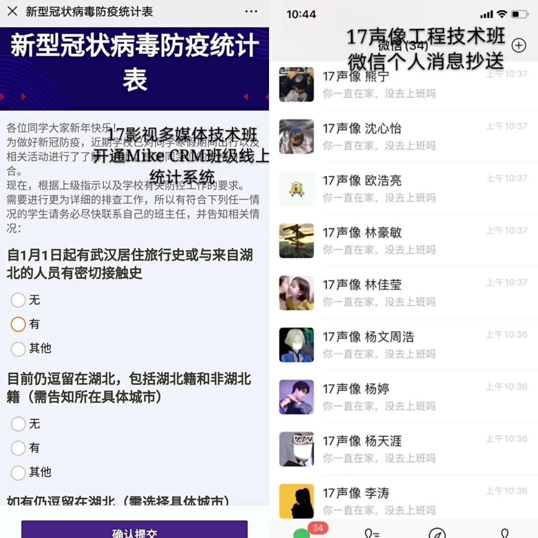 5个毕业班三管齐下防疫战疫、就业准备、论文答辩层层推进,17声像工程班采用微信短消息每日抄送每条信息落实到人,17音像技术班运用wps云文档协作功能及时更新班级学生实习就业最新信息,17影视多媒体班运用MIike CRM线上统计系统每日汇总学生情况,17摄影摄像班通过视频进行集体论文辅导,17影视编导班运用百度网盘进行学生健康码“云审核”制度,学生健康状况一键掌握。