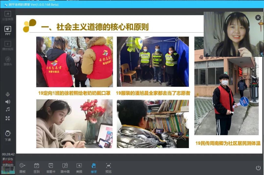 脚踏实地是她的工作态度,开拓创新是她的教育志向。特别在疫情期间,胡芊带领着教研室老师积极探索线上教学模式,从线上授课方式到线上学生管理办法,经过老师们一次次的线上教研会议,已经形成了一套成熟的体系。在严峻的疫情下,除了保证线上课程的顺利展开,胡芊还努力当好战“疫”宣讲员,主动转型、因势而新,以“疫”讲“思”,以教抗疫。课堂上,她变身网络“主播”频出奇招,现场连线、直播朗诵、头脑风暴、限时投票……为了引导学生关注疫情发展,胡芊还收集授课班级学生的抗疫故事,让身边的模范感召学生,将“疫情危机”转化为“教育契机”。