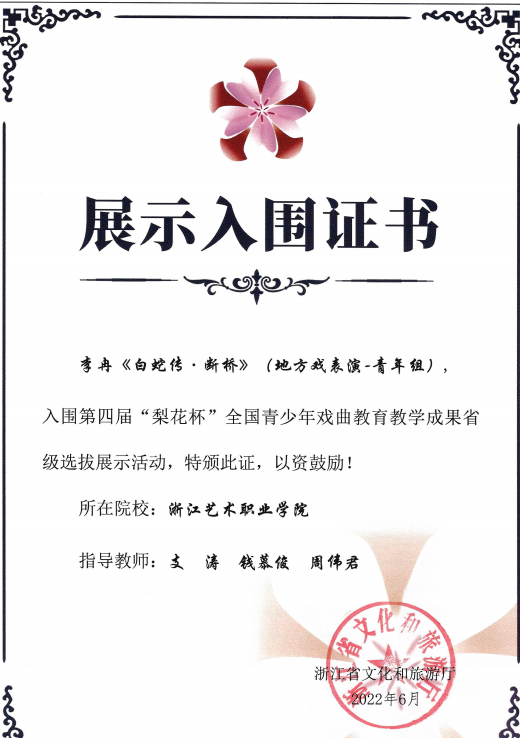 2017级温州越剧班李冉入围第四届“梨花杯”全国青少年戏曲教育教学成果省级选拔展示活动证书