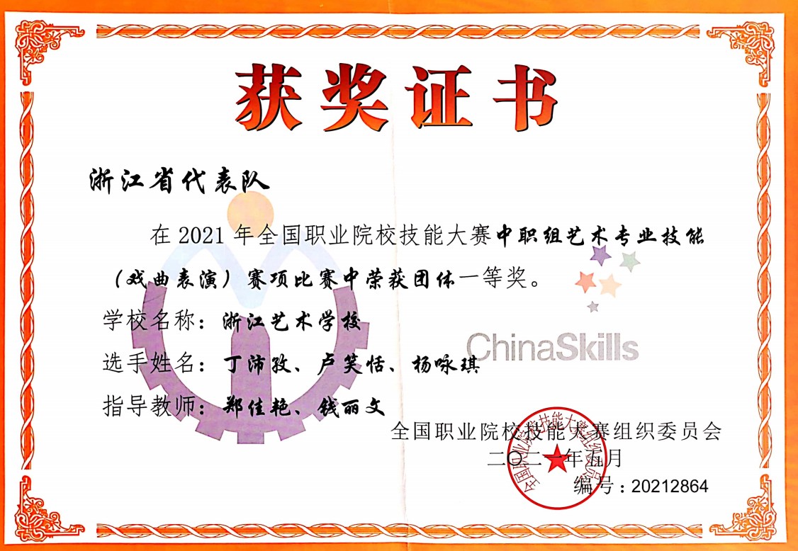 2016级浙越班陆祎杨获2019年浙江省中等职业学校职业能力大赛艺术专业技能(戏曲表演)项目一等奖证书