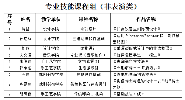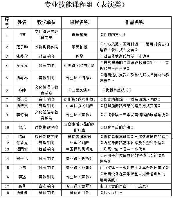本次比赛共36名教师参加,分为专业技能课程组(表演类)、专业技能课程组(非表演类)、公共基础课程和专业理论课程组三组。其中,专业技能课程组(表演类)18人,专业技能课程组(非表演类)9人,公共基础课程和专业理论课程组9人。