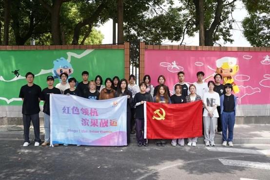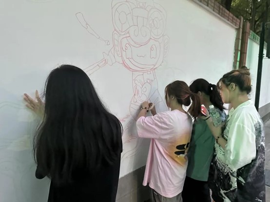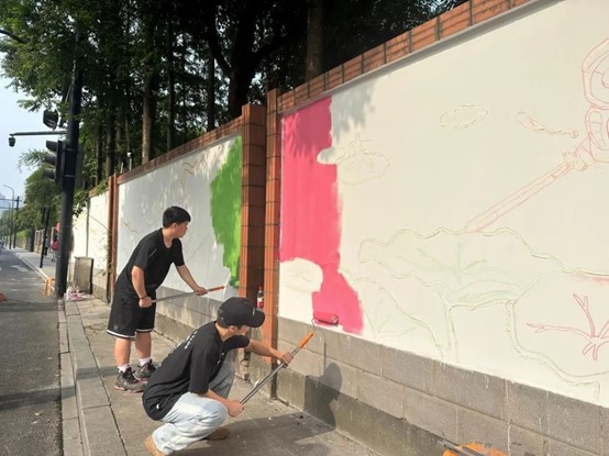 烈日当空,活动过程中,同学们分工合作、积极行动,根据各自的草图,用手中的画笔,一次次进行定位、起形、勾勒、调色、上色,以艺术的方式表达了对杭州亚运会的美好祝愿。