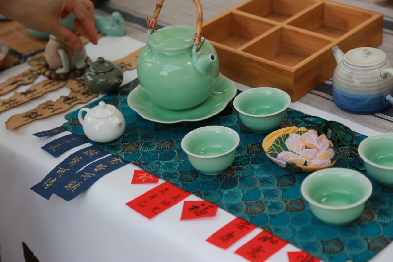 在非遗集市区域,清凉扇市、越窑青瓷、手工勾线等具有民族特色的非遗摊位体验吸引不少游客的目光,展台上摆满了琳琅满目的非遗展品。