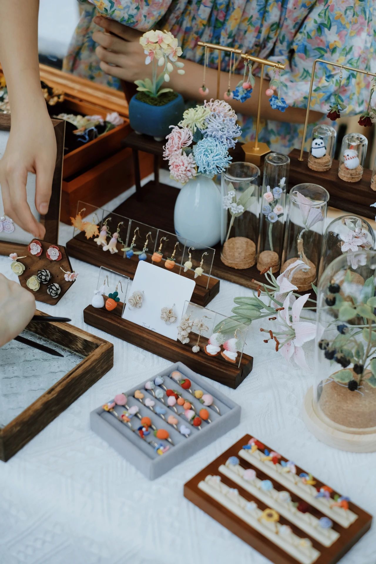 最受大家喜爱的是手工勾线,一根根彩色的勾线,在巧手编织下,摇身一变成了各种精致的手工艺品。耳钉、胸针、吊坠,还有彩色花艺,让游客们喜爱万分的同时,感叹手工艺的精巧。