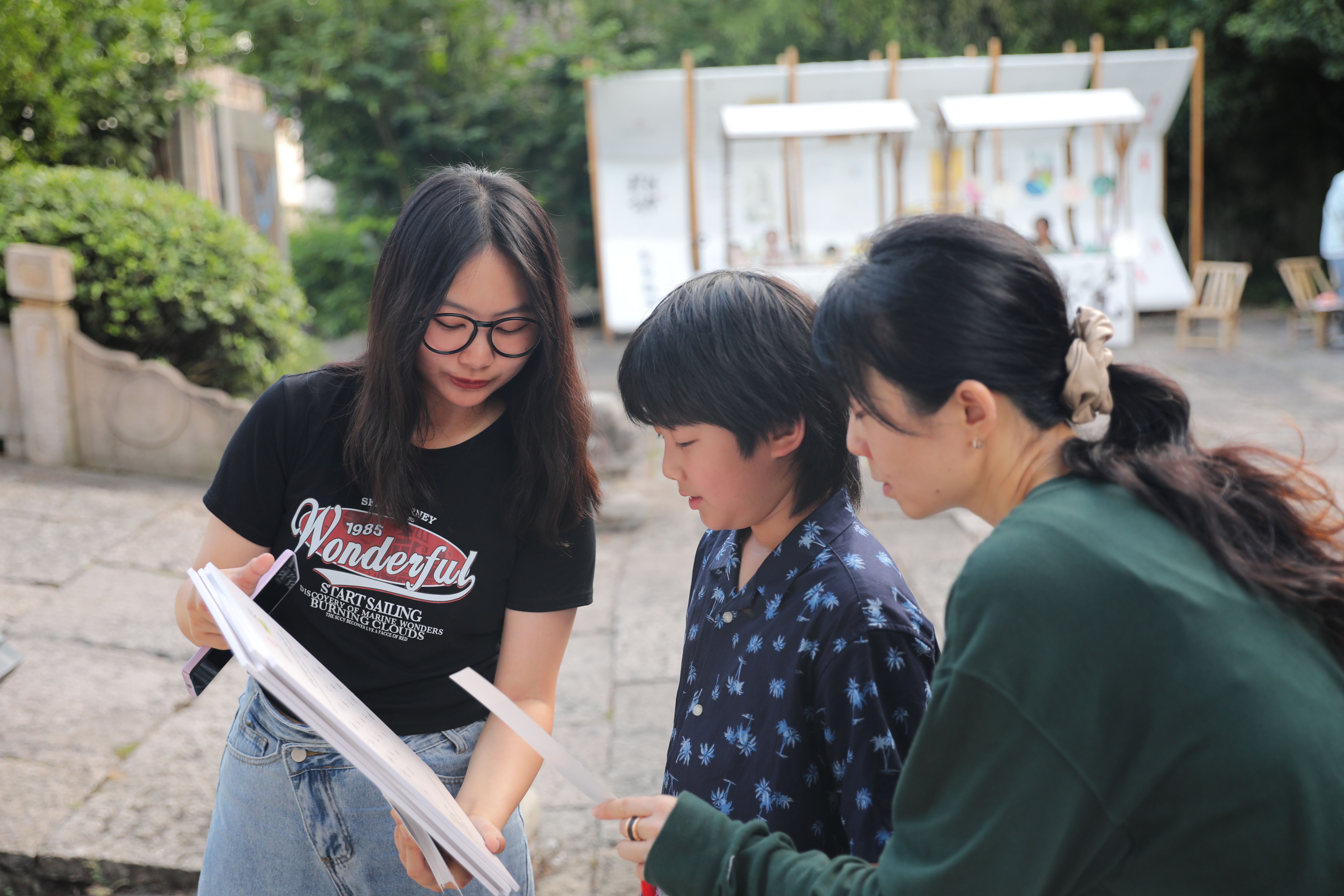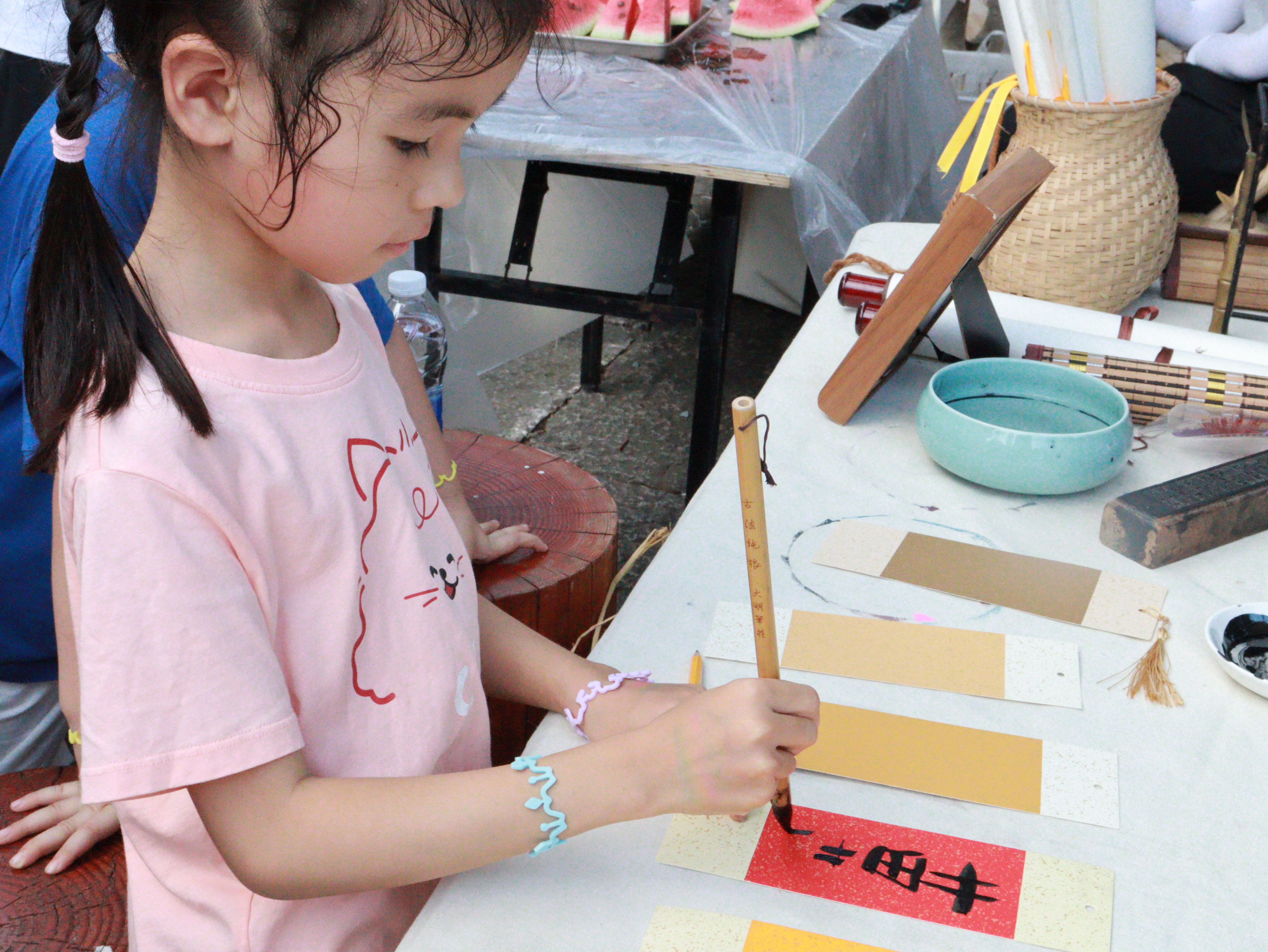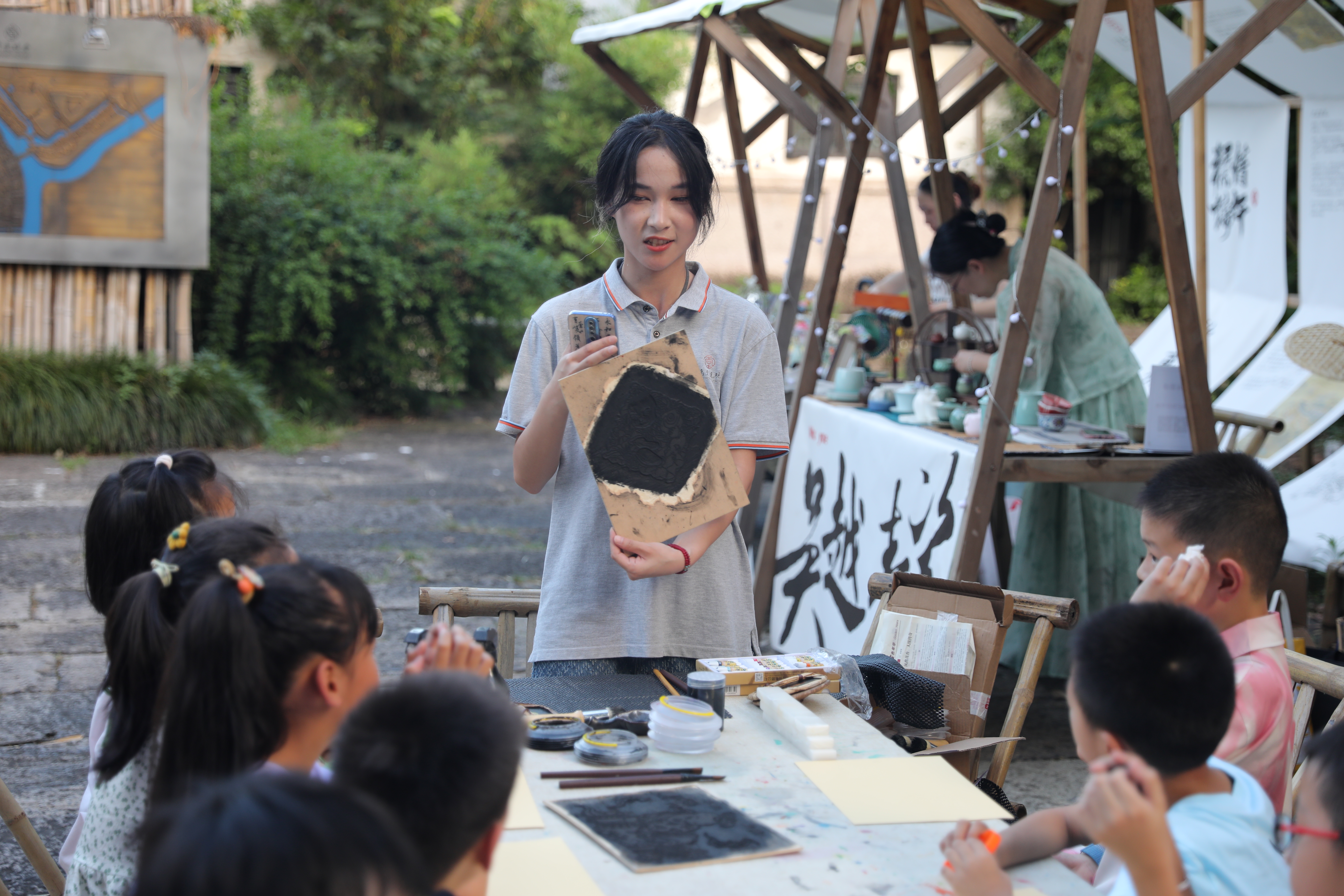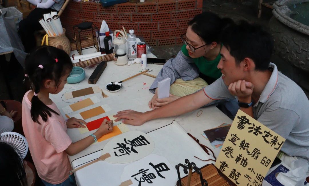 以笔之力开启汉字美学之旅。在书法体验区,手工艺学院学生讲授起笔、行笔技巧和如何掌握书写中的轻重缓急,激发游客们对汉字美感的追求。