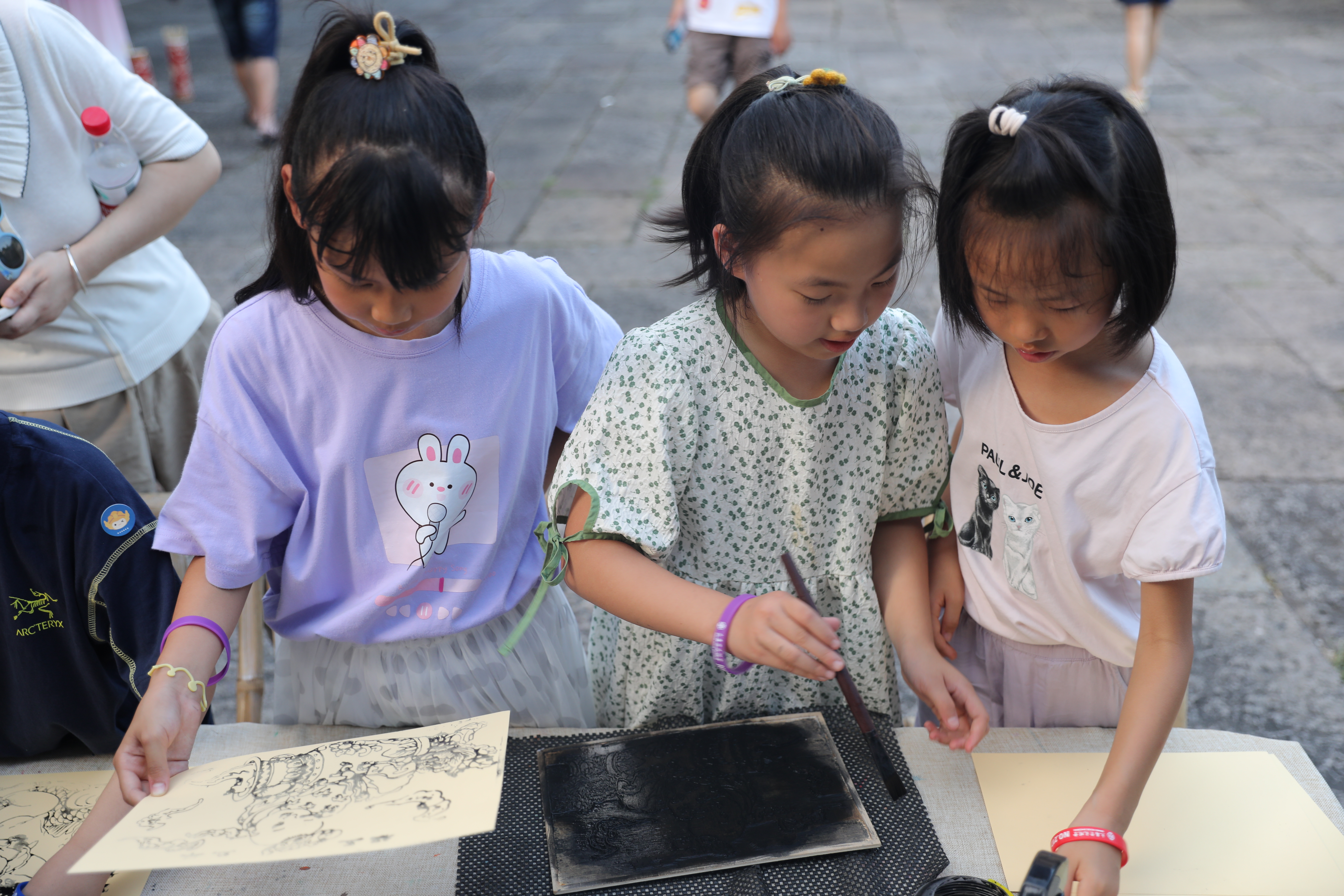 以刀为“笔”,木刻韶年。手工艺学院学生现场教学讲授绘、刻、印等一系列制作流程,带领游客们体验水印木刻的过程,让宣纸、木板和颜料奇妙融合。