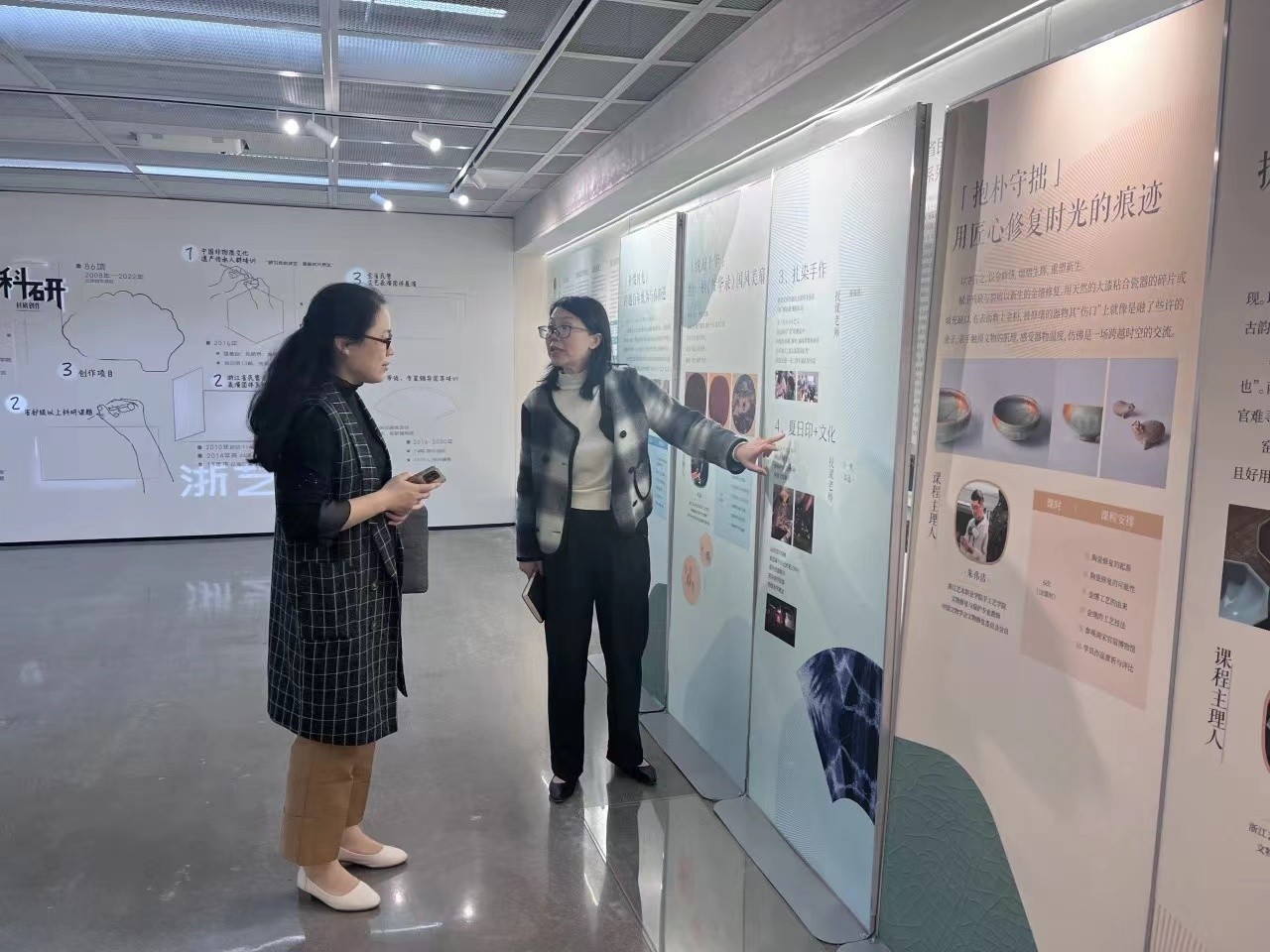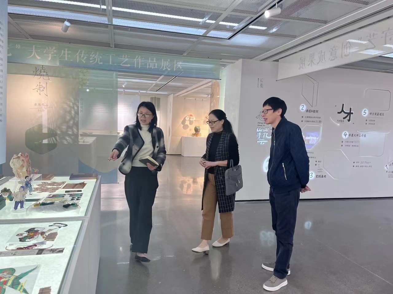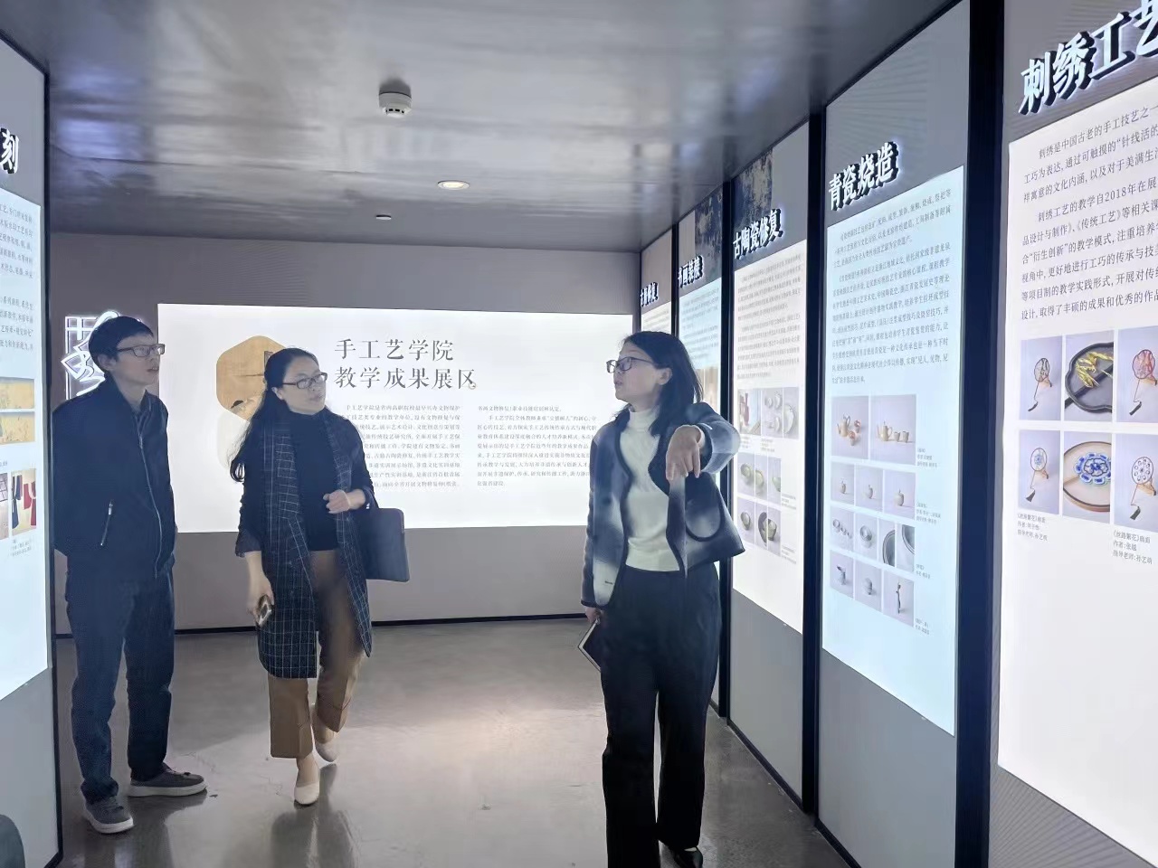 手工艺学院党总支书记钟黎介绍了学院课程体系、学生优秀作品以及人才培养方案等内容,学院领导班子陪同参观“匠心守艺”非遗创意成果展,希望与浙江旅游职业学院旅行服务与管理学院加强院际交流与合作,共同探索学院发展和人才培养新路径。