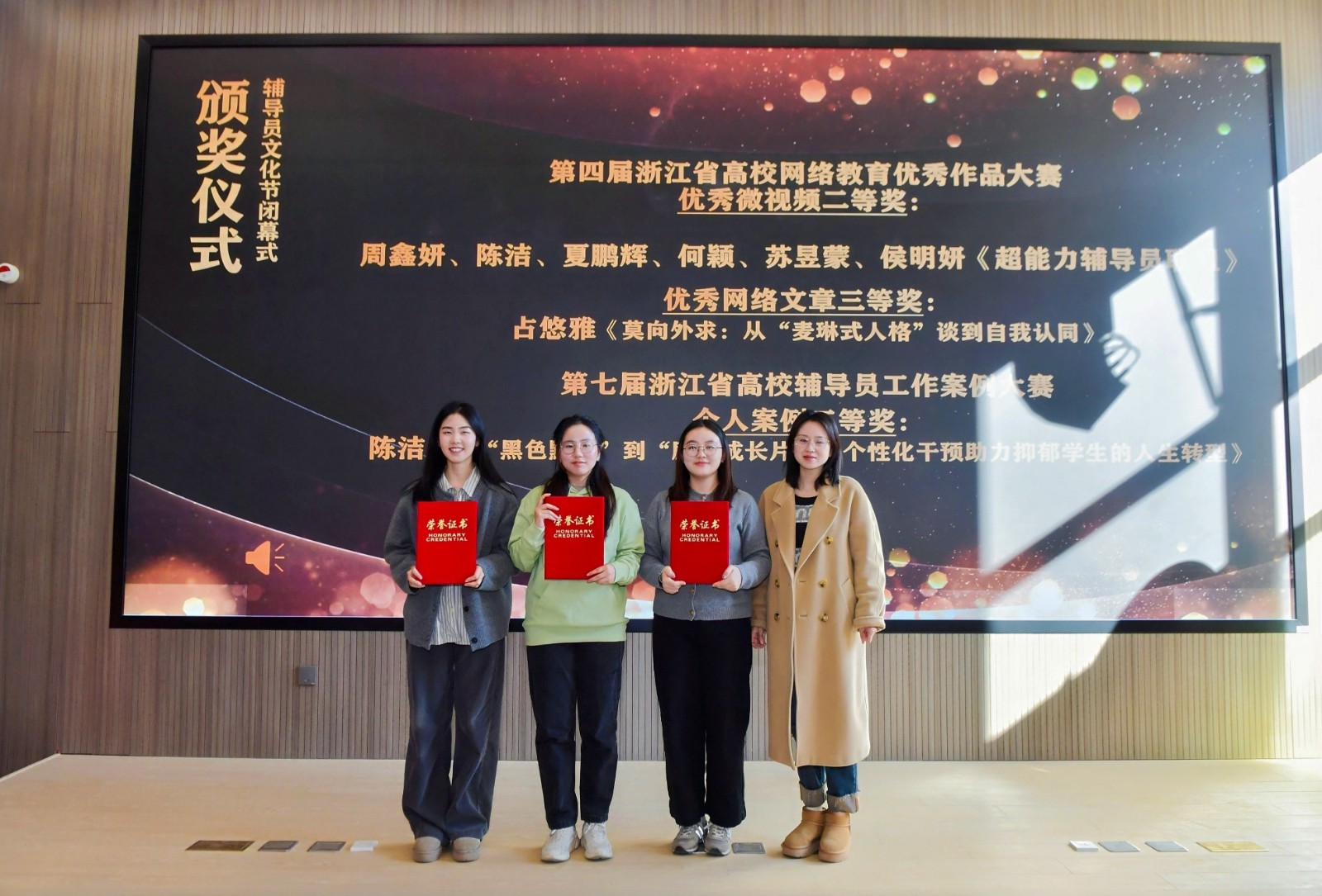 会上对我校近期获得省级荣誉的辅导员进行表彰,并对获奖作品进行展演。
